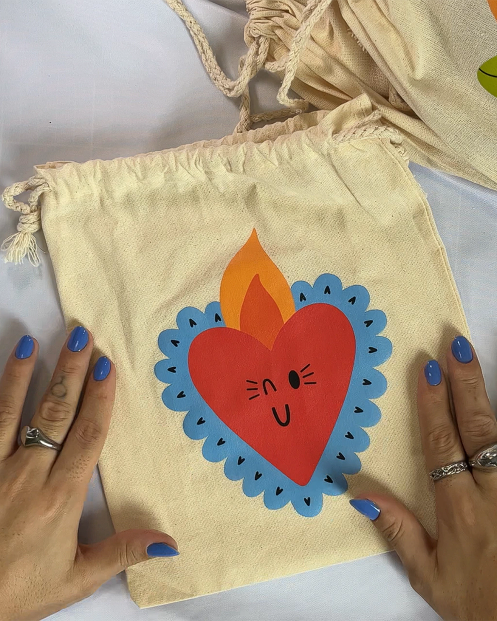 saquinho de algodão cru estampado em DTF com estampas autorais da laís desenha :)